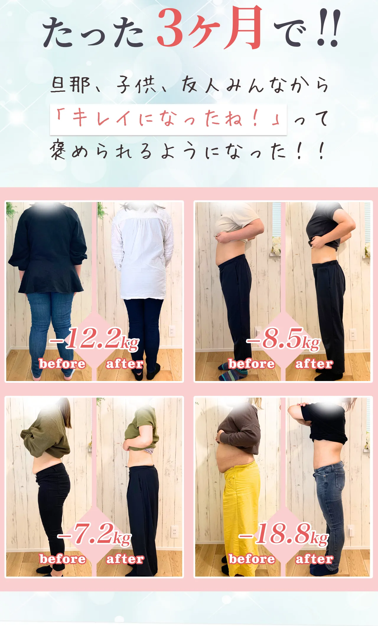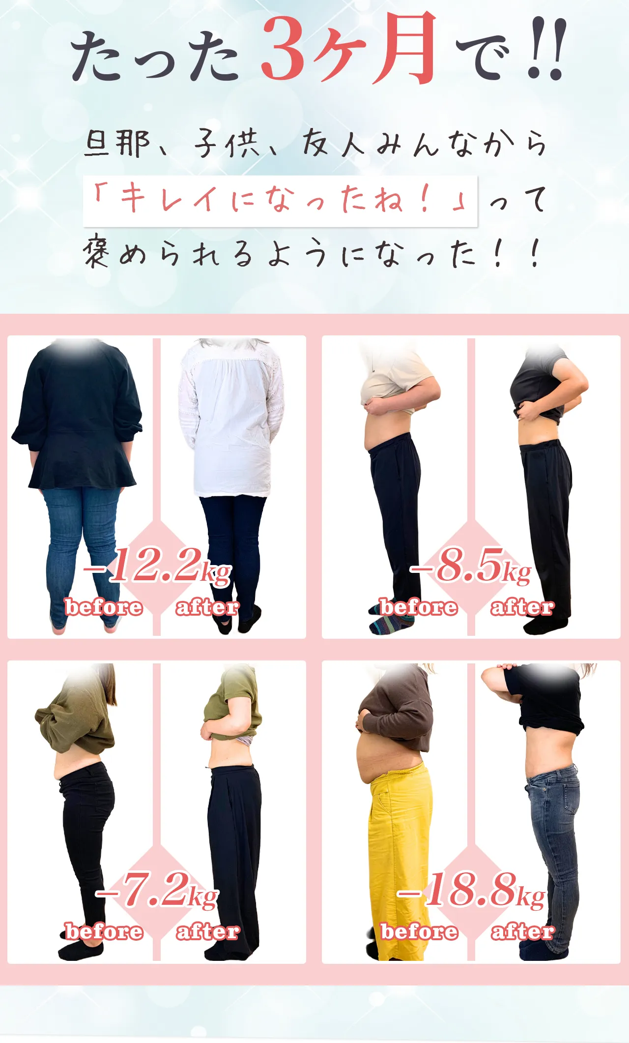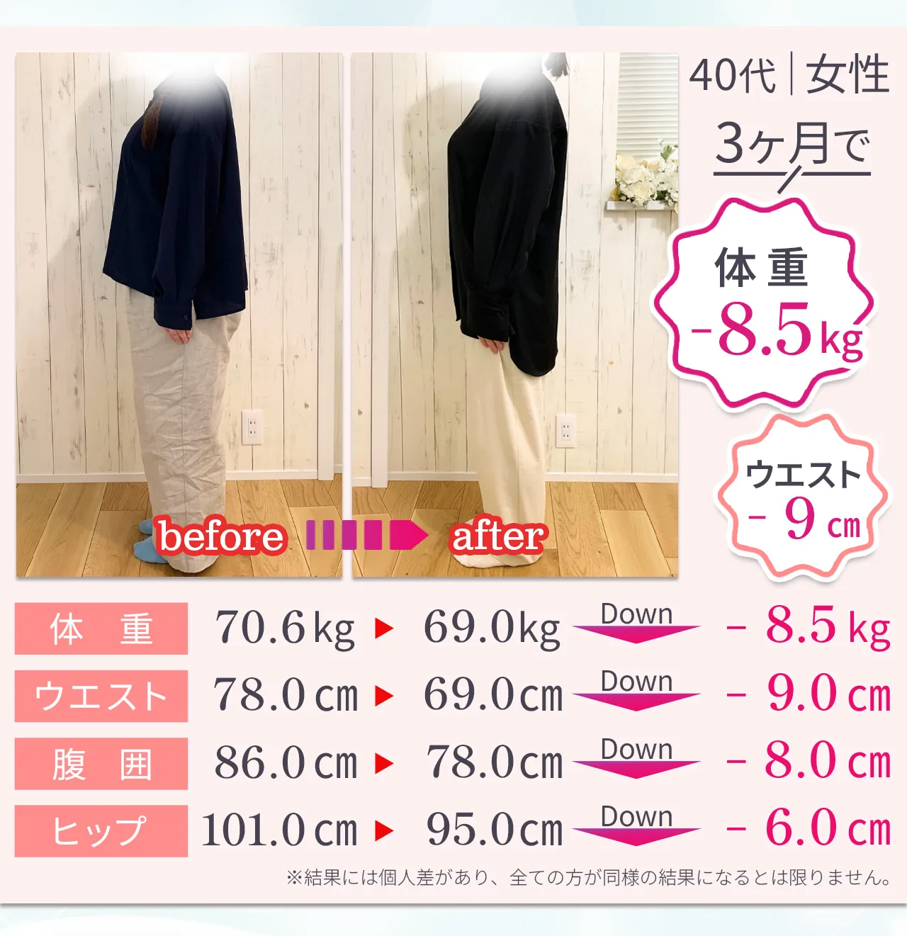 | 効果の 持続性 | 代謝アップ&体質改善で長期的な変化が期待できる | 運動をやめるとすぐ 戻ってしまう | 一時的な見た目の変化 |