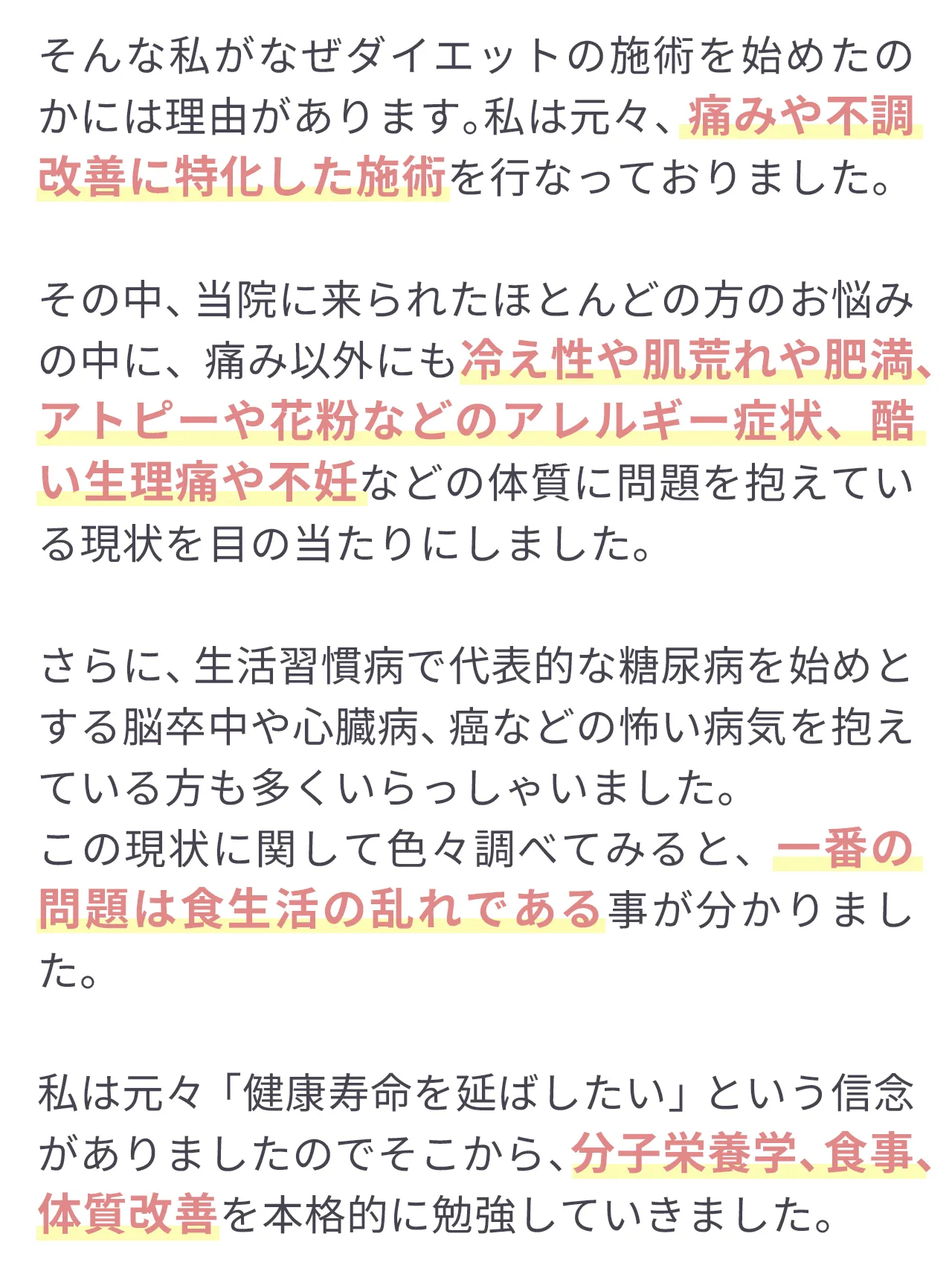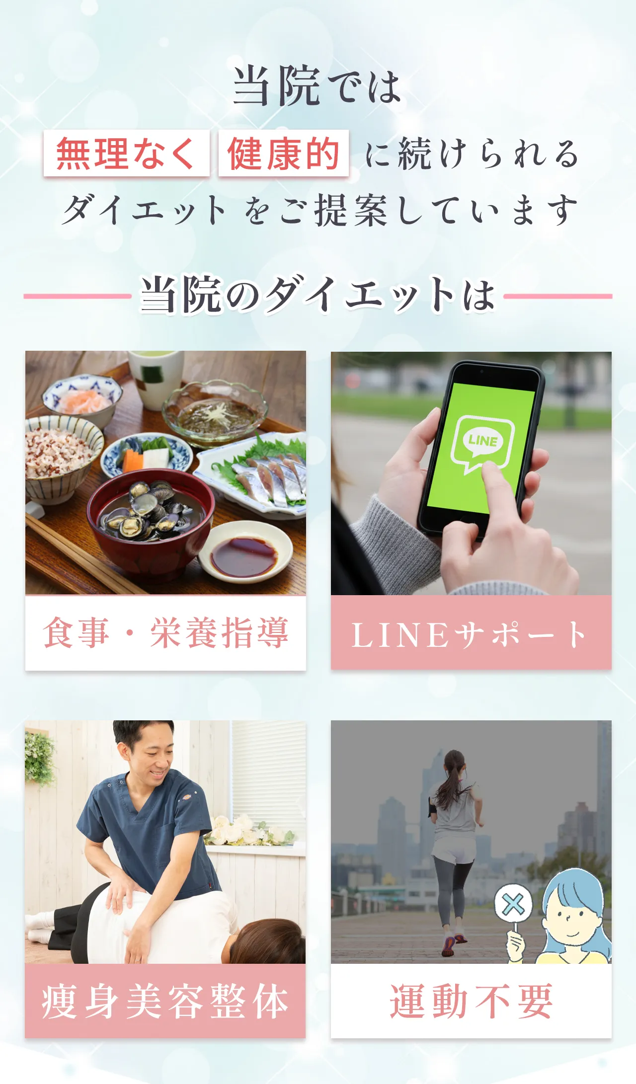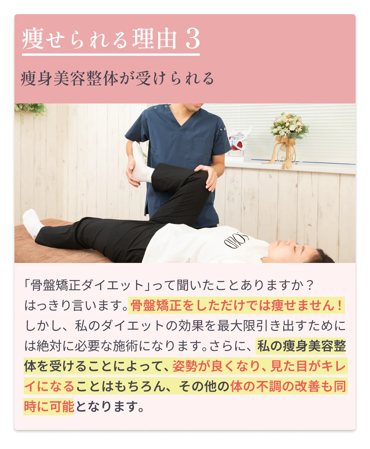 | 体の負担 | 無理なく整える、自然で健康的な方法 | 関節や筋肉に負担が かかることも… | 痛みはないが根本改善にはならない |
