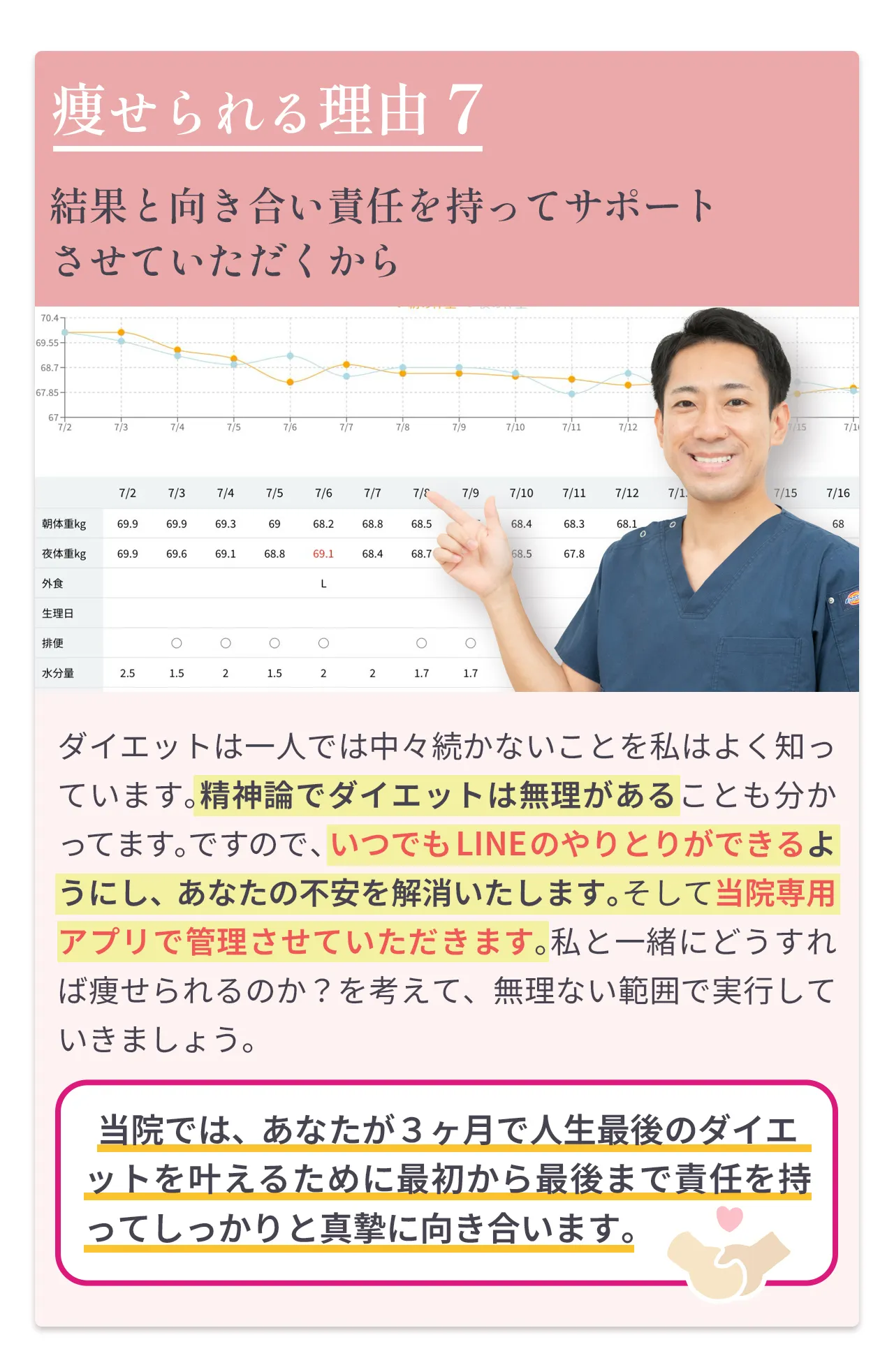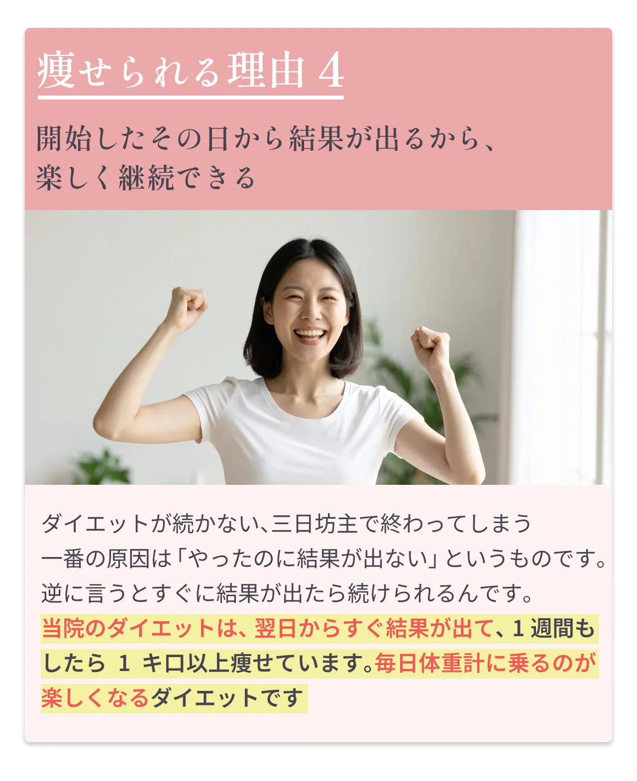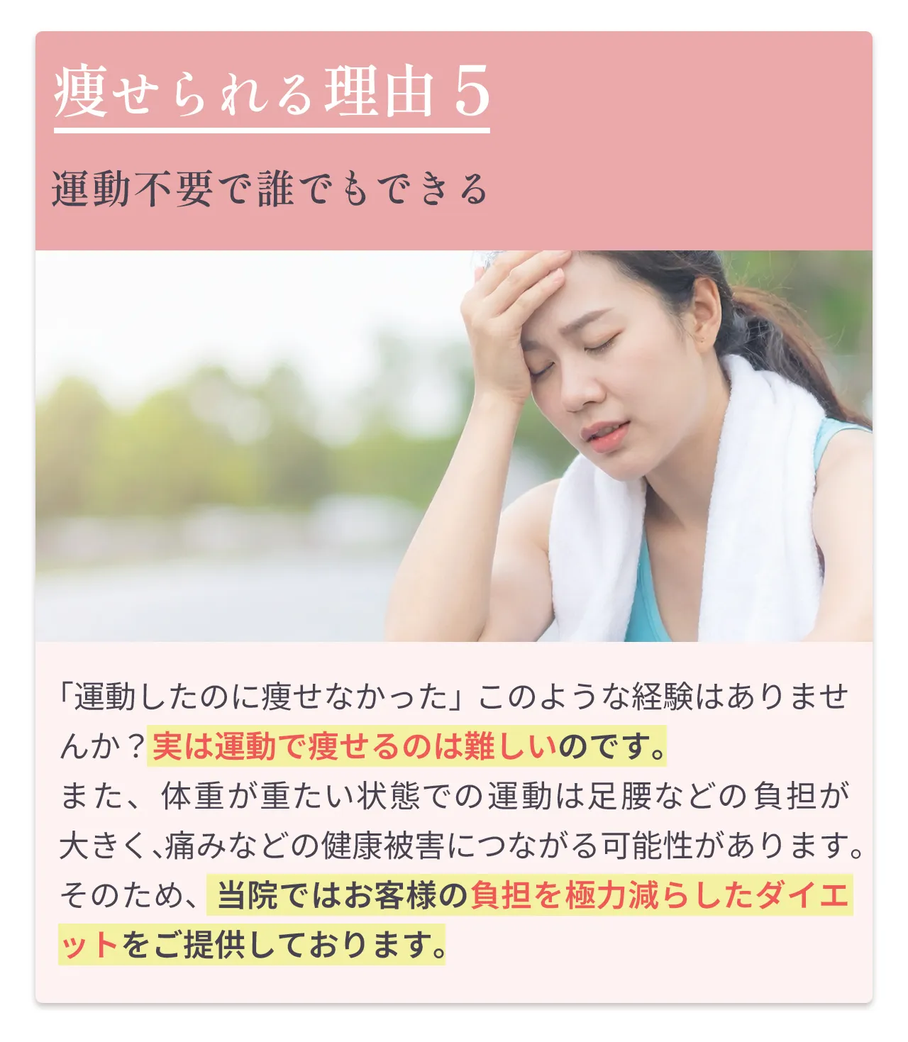 | 継続 | 特別な運動や制限なしでムリなく続けられる | 体力・時間が必要 | 楽だが、通い続ける必要あり |