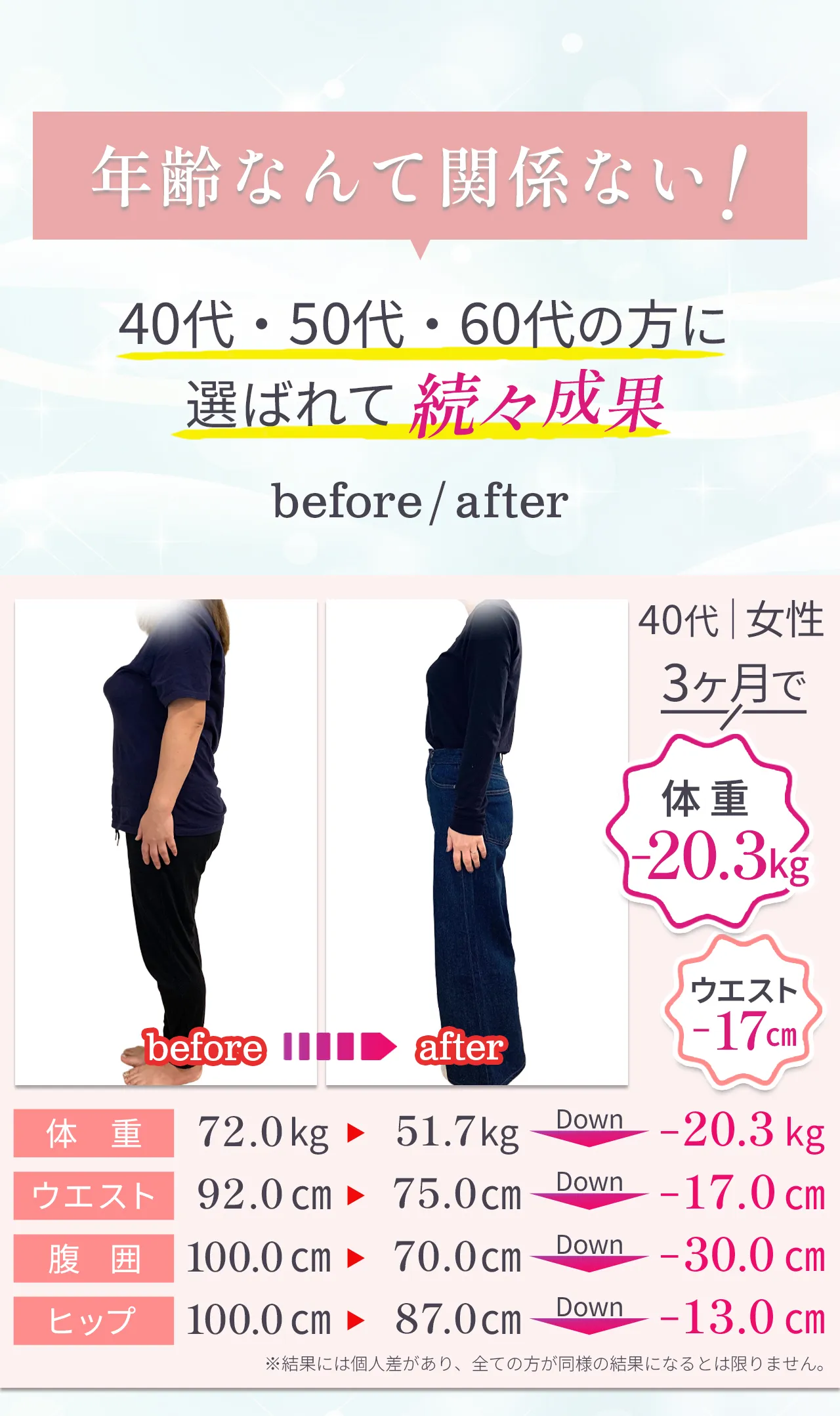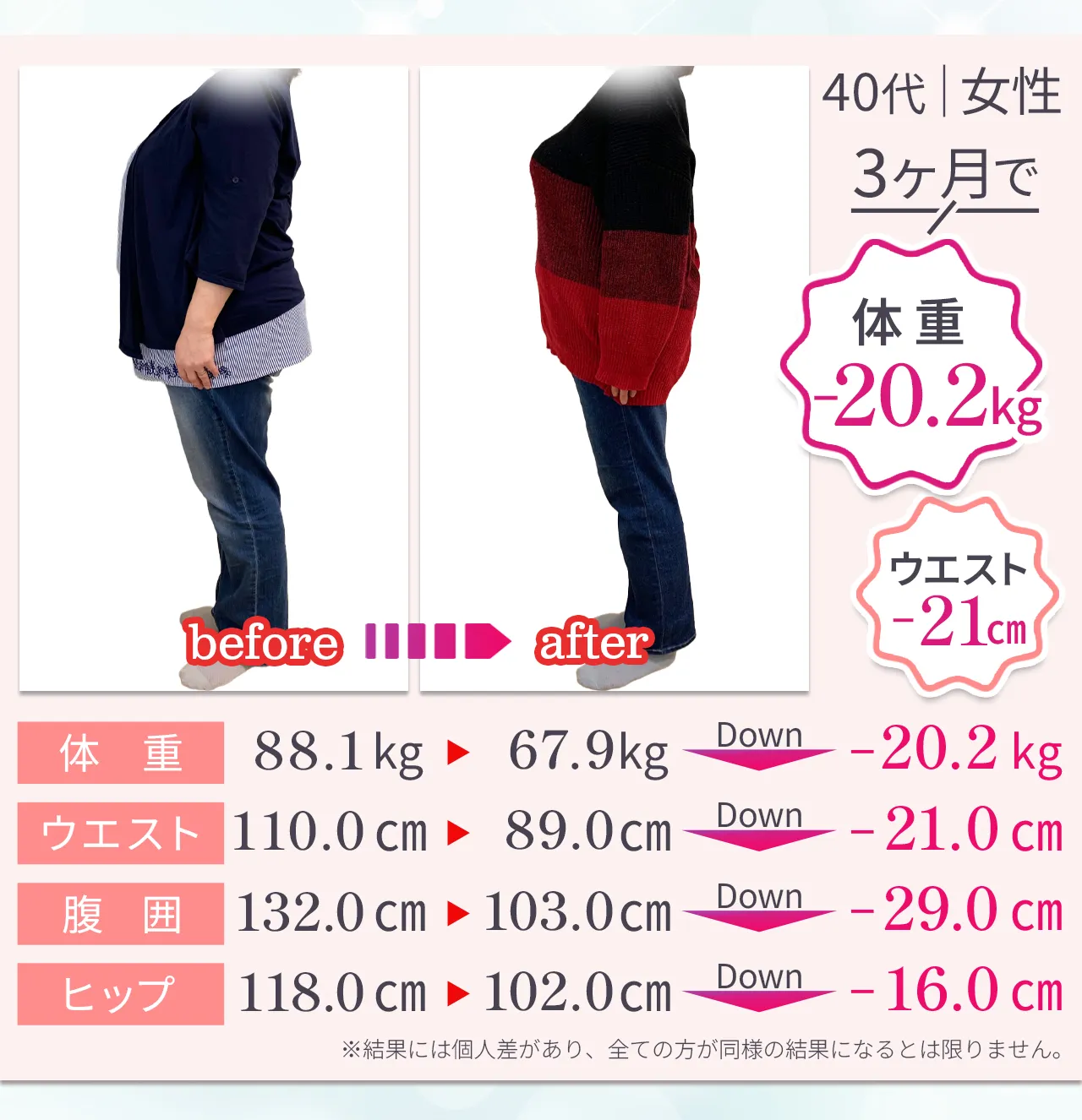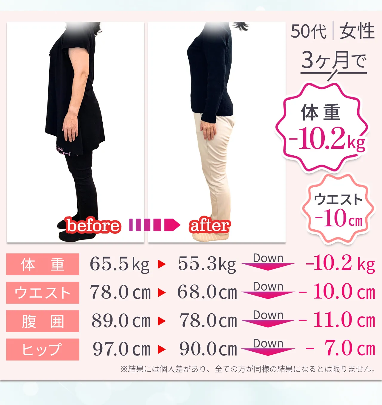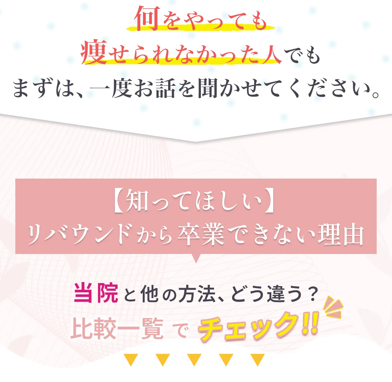 | リバウンド | “習慣化” で卒業後も体型キープ | 運動をやめると、 戻りやすい | 施術をやめると戻るケースが多い |