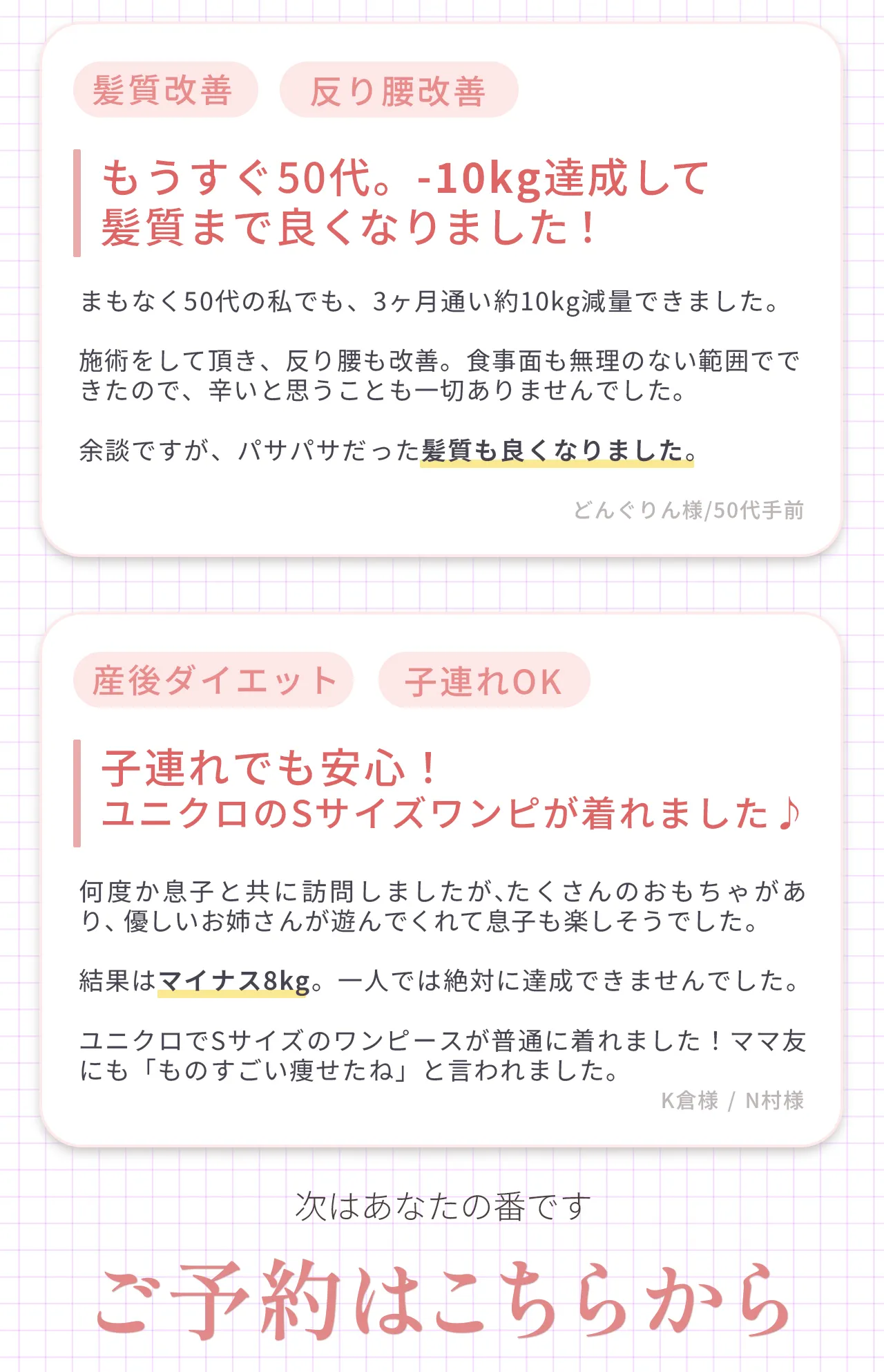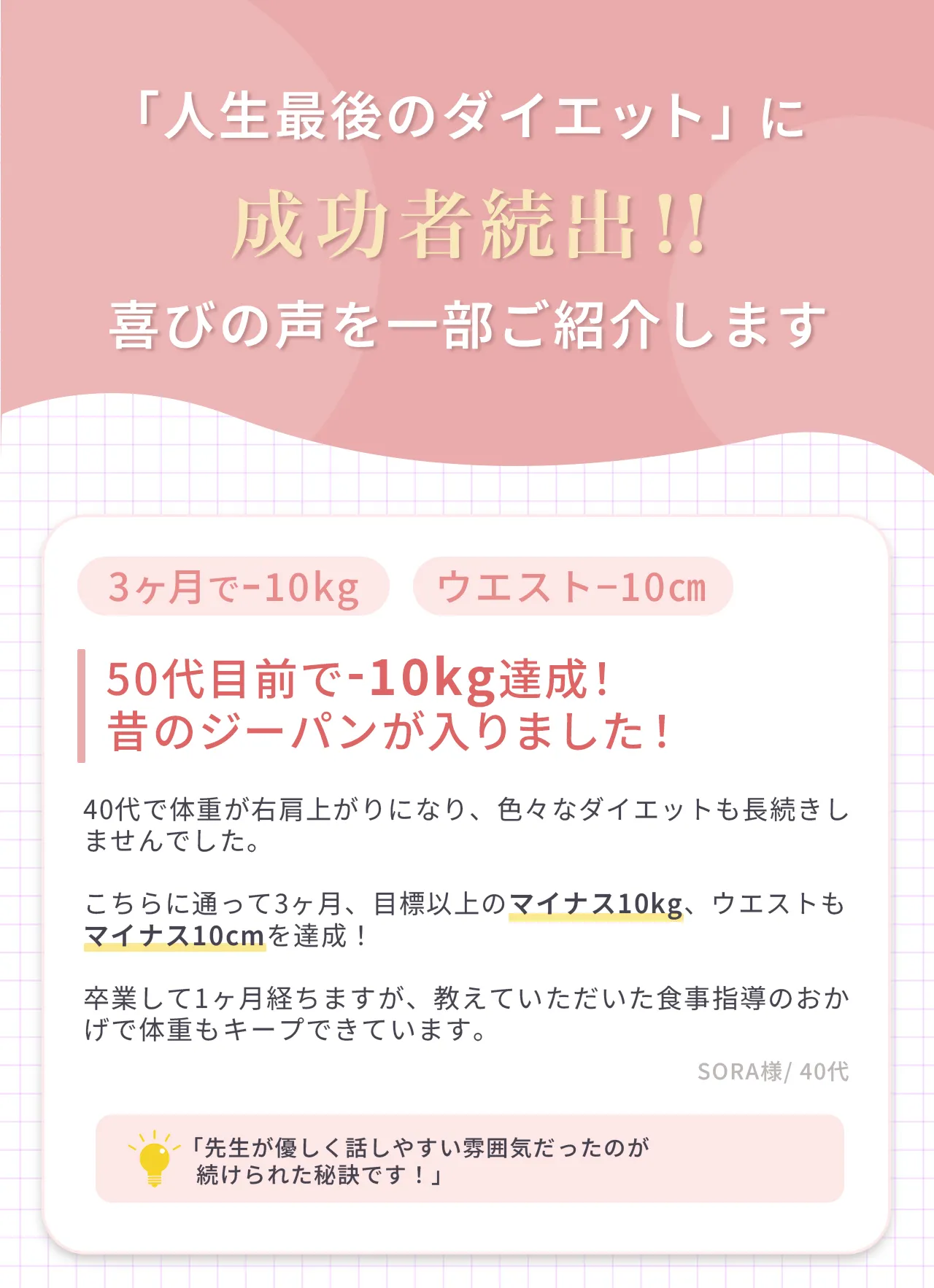 | 得られる 知識 | “食べ方や整え方”が自然と身につくから、ずっと活かせる | 運動法は学べるけど、 食生活は自己流のまま | 習慣にできる学びなし |