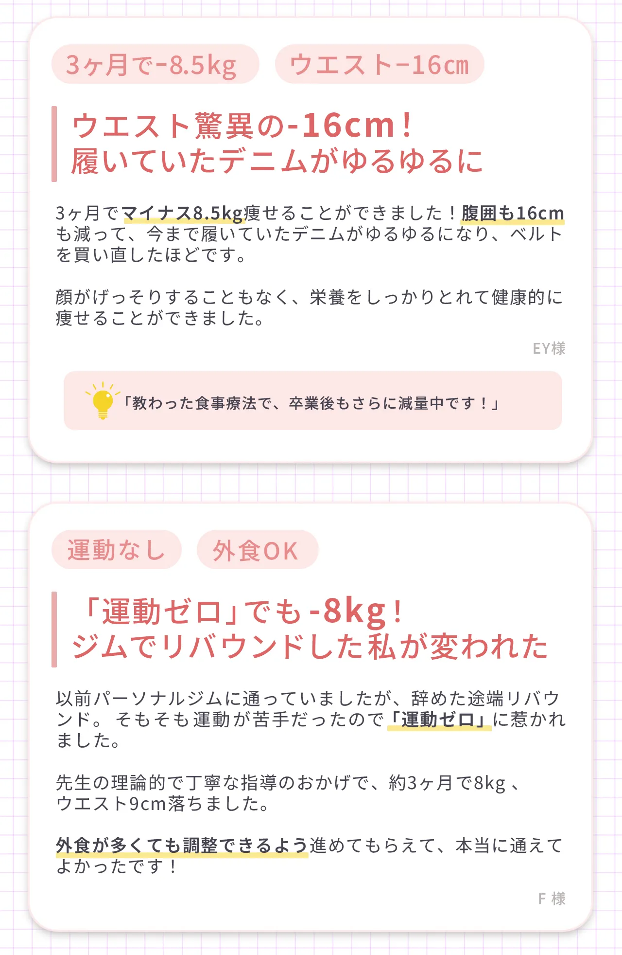 | 得られる知識 | “食べ方や整え方”が自然と身につくから、ずっと活かせる | 運動法は学べるけど、 食生活は自己流のまま | 習慣にできる学びなし |