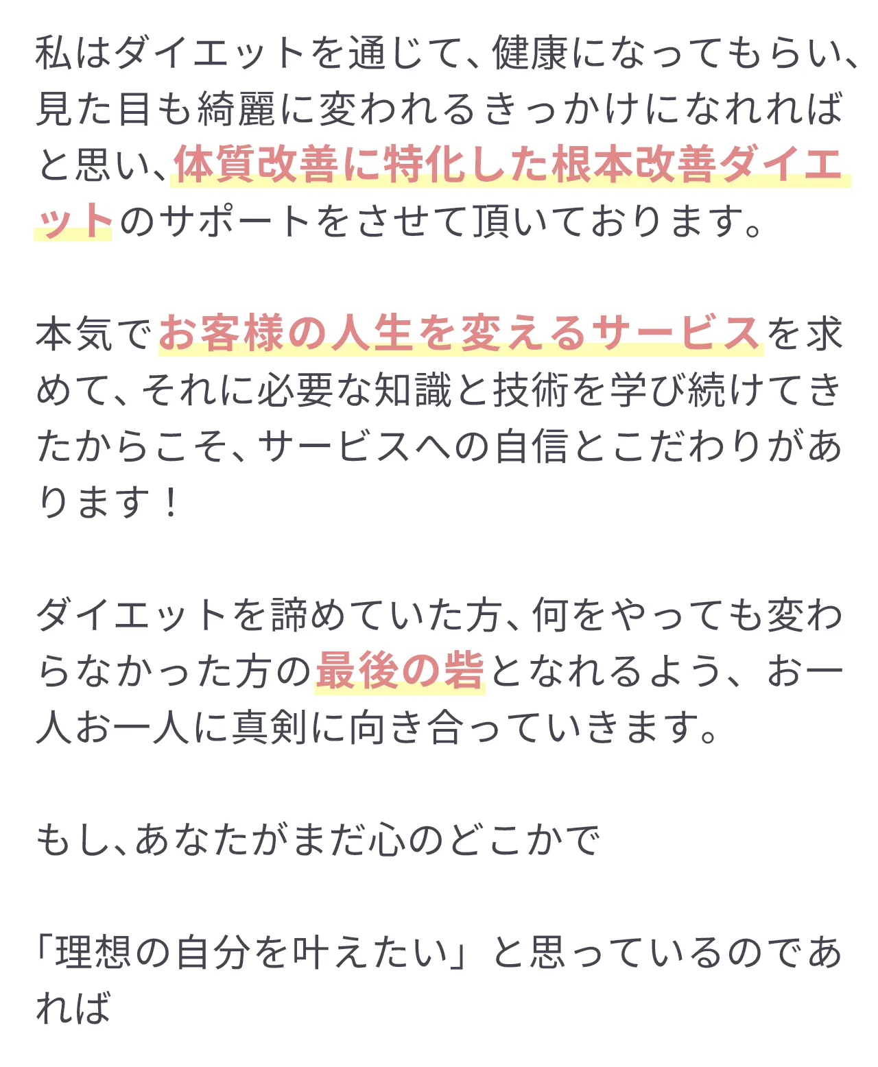 | 効果の持続性 | 代謝アップ&体質改善で長期的な変化が期待できる | 運動をやめるとすぐ 戻ってしまう | 一時的な見た目の変化 |