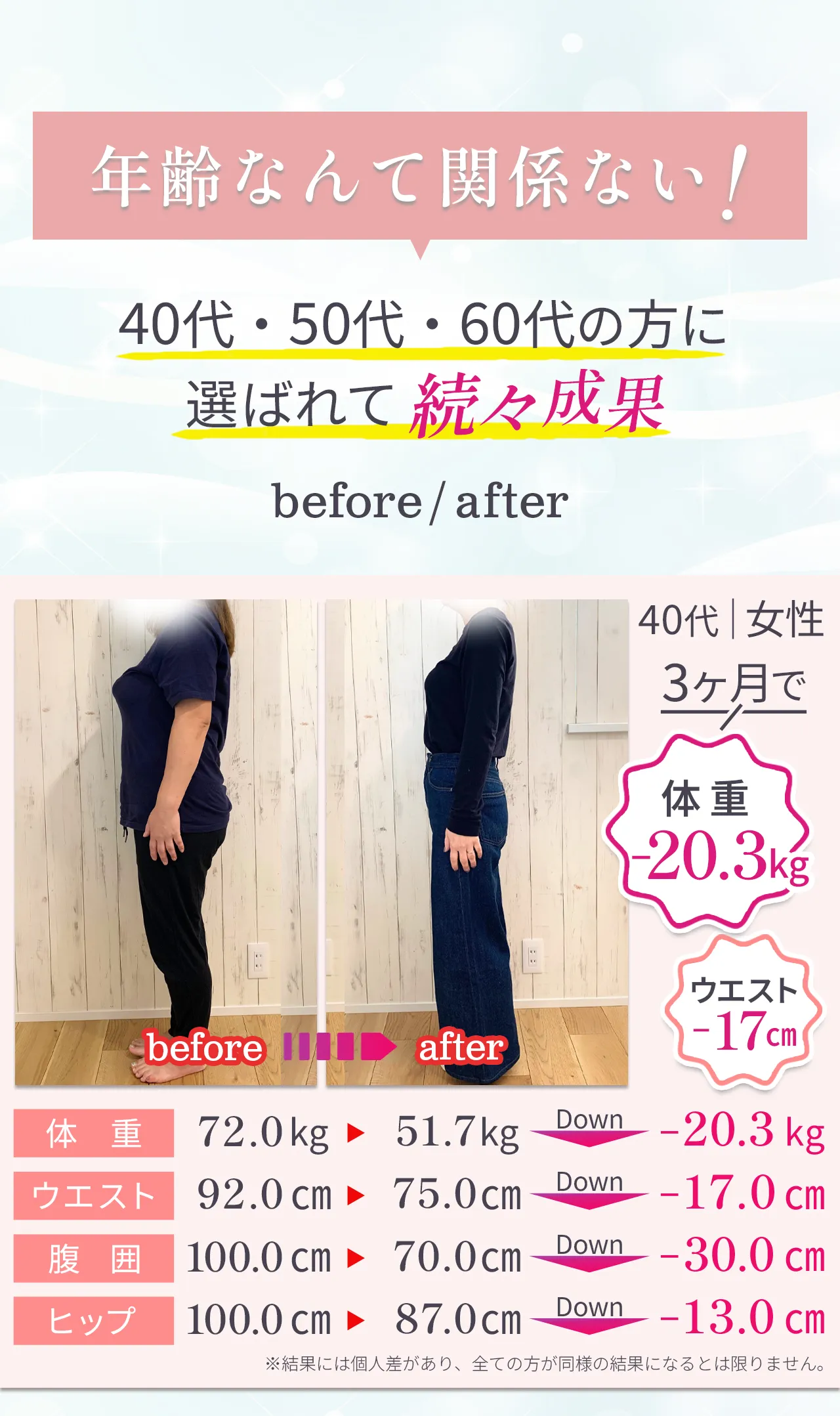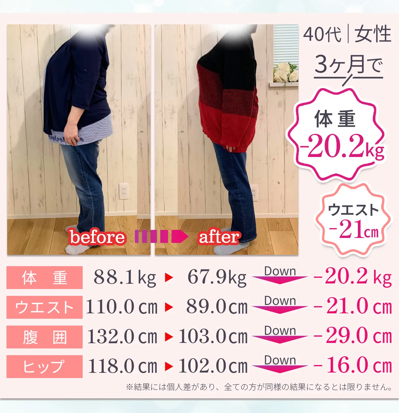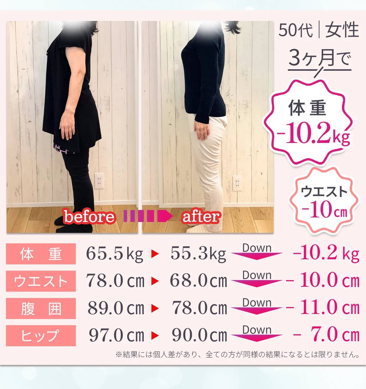 | リバウンド | “習慣化” で卒業後も体型キープ | 運動をやめると、 戻りやすい | 施術をやめると戻る ケースが多い |